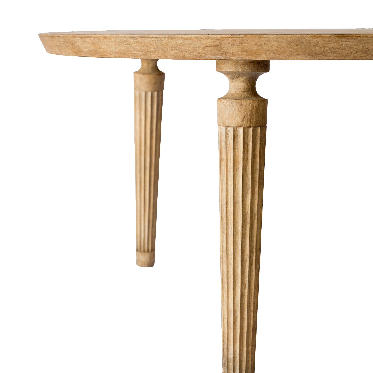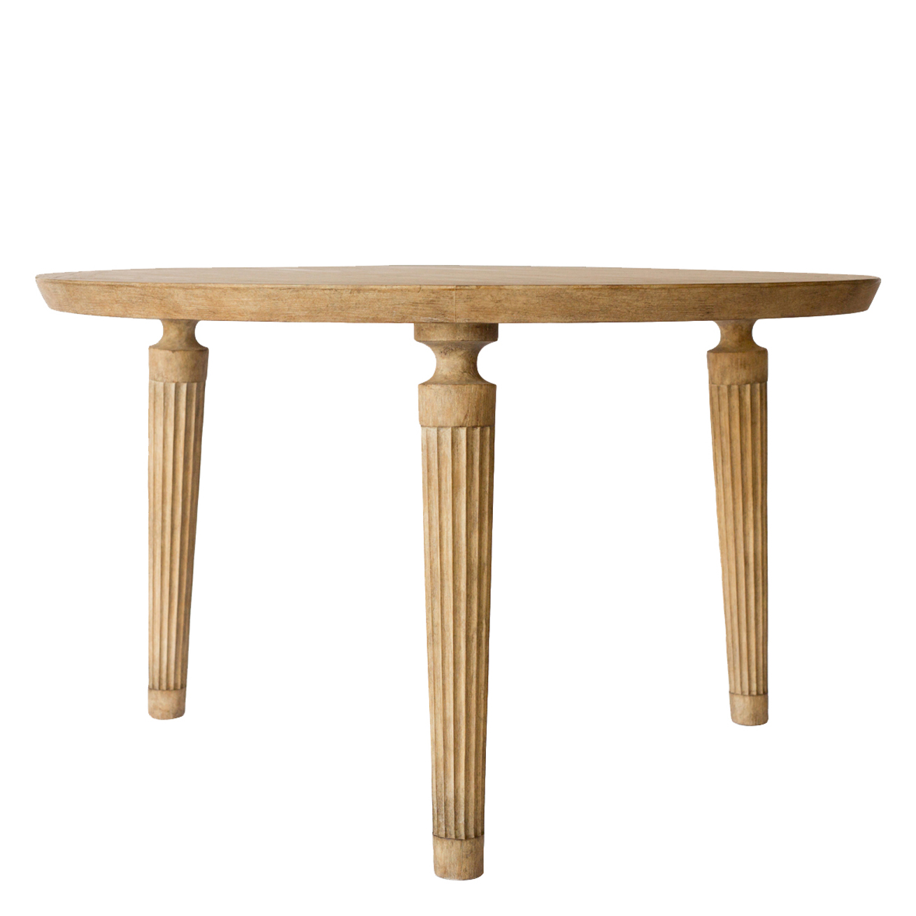 Table featuring 2″ thick top with angled edge detail and 3-1/2″ border atop three hand-fluted legs.