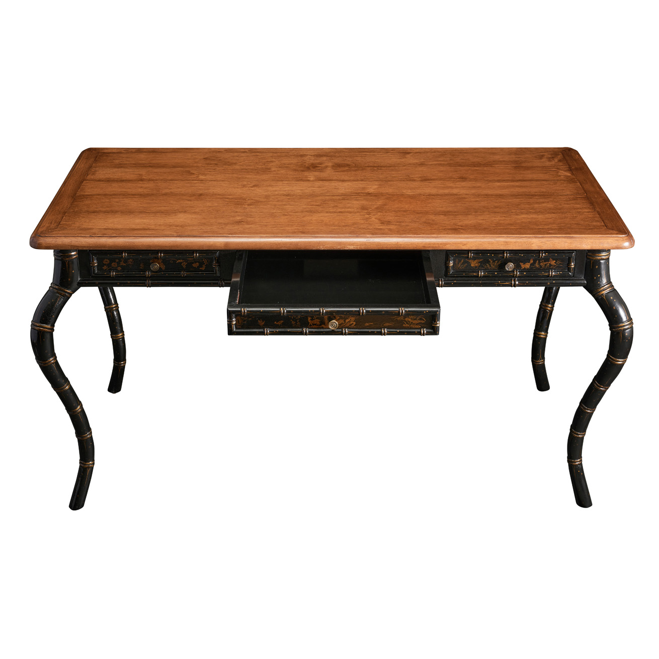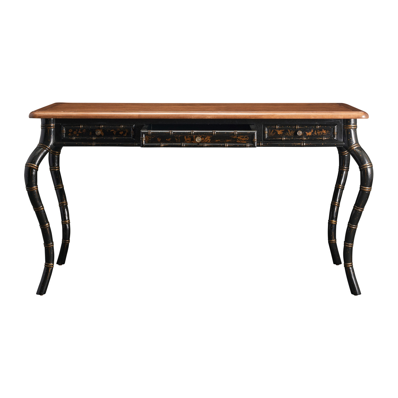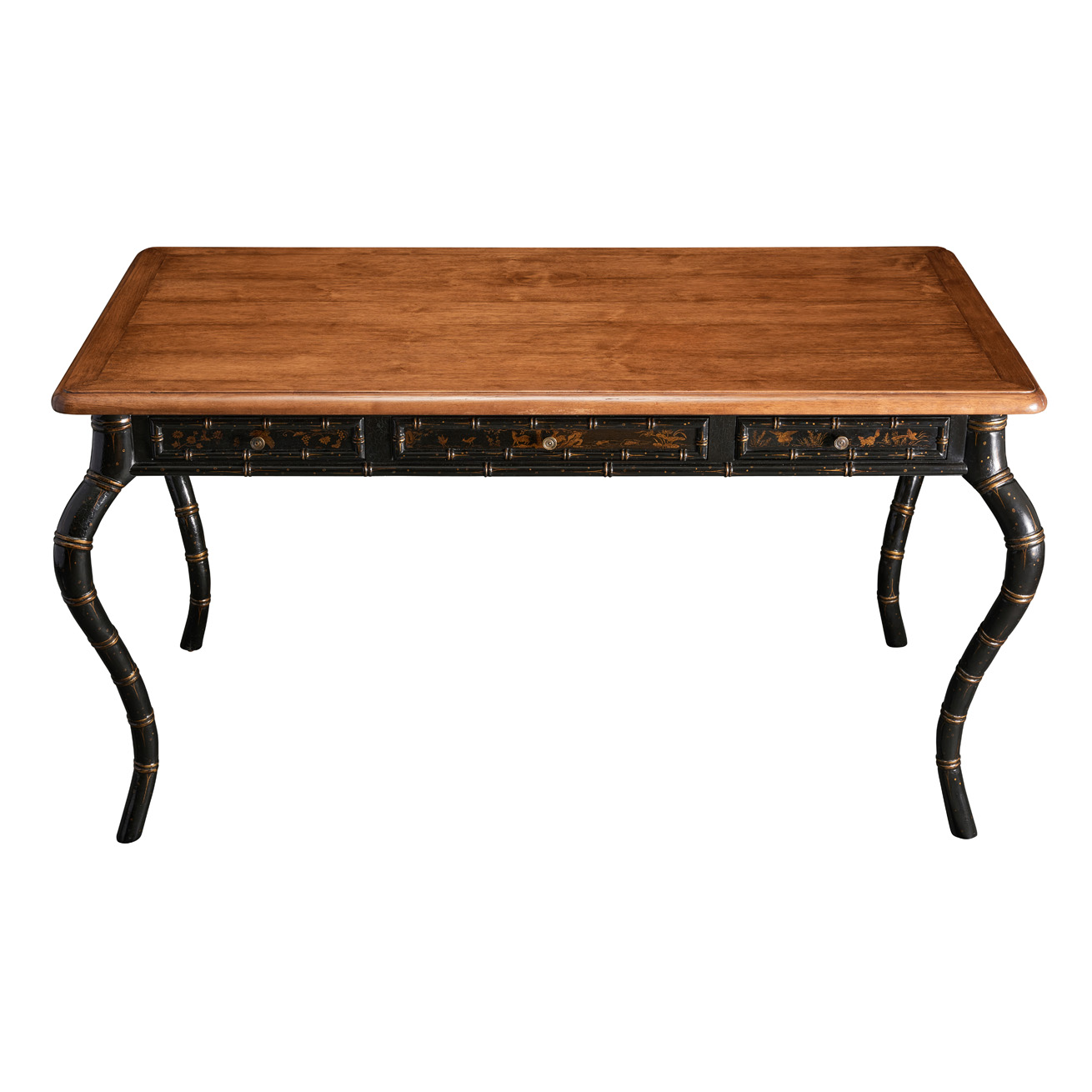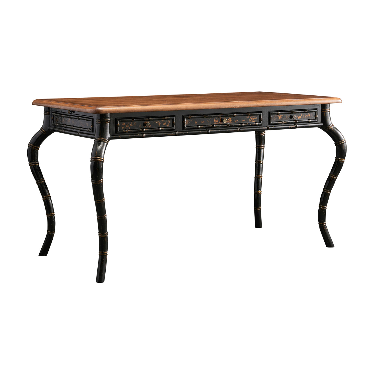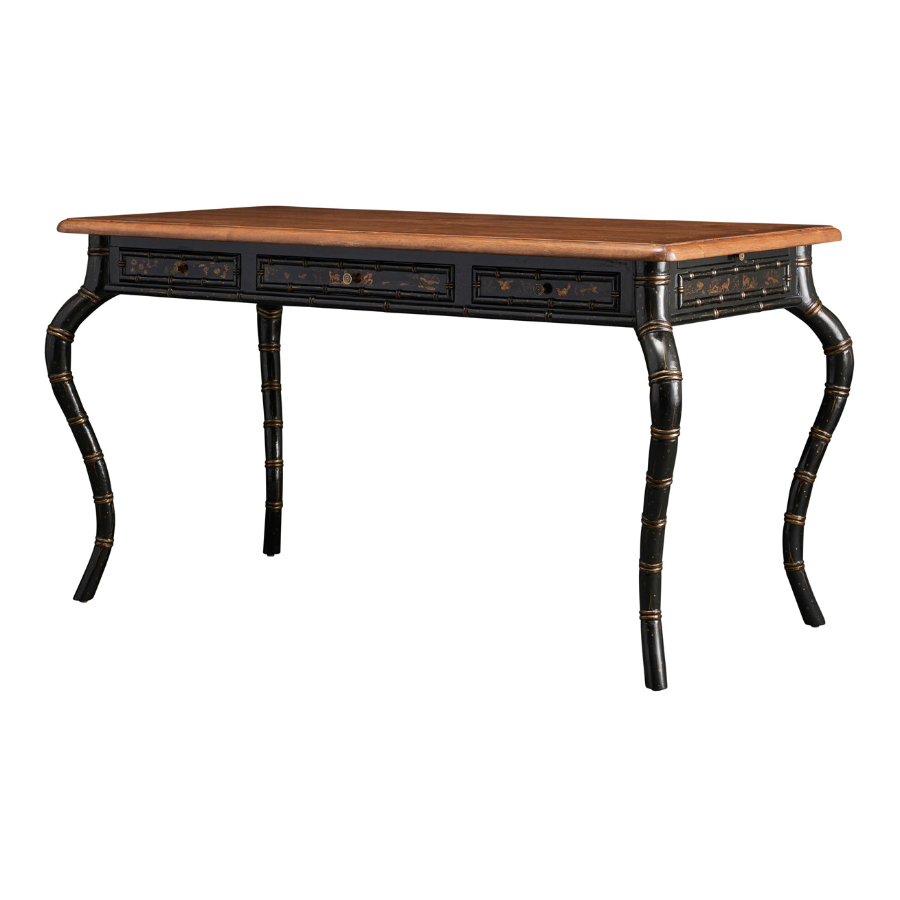 Desk featuring three drawers, two pullout shelves at sides, and faux bamboo carved cabriole legs.