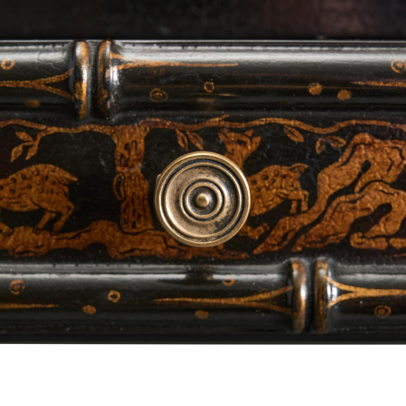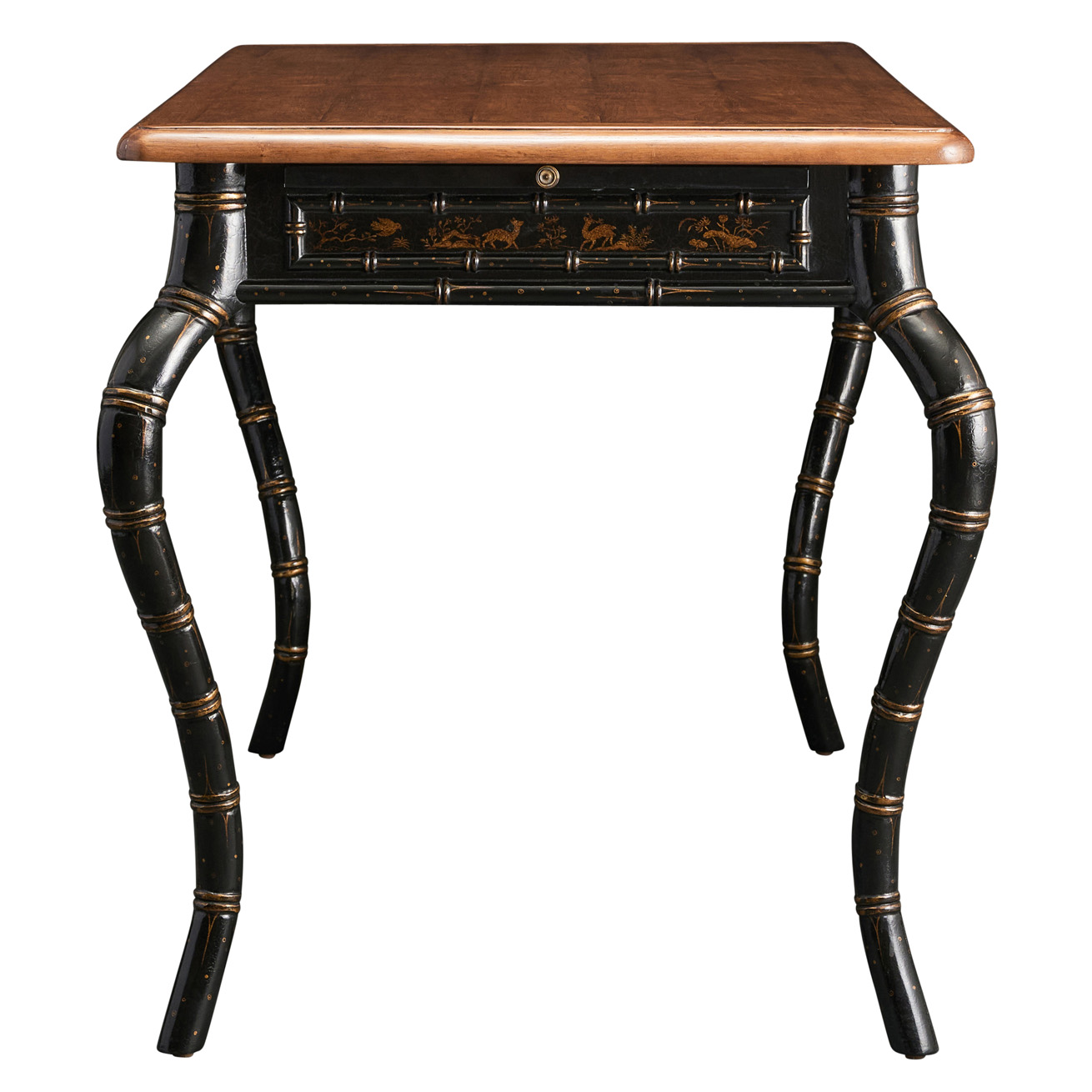 Finish: Top: Medium walnut. Legs & Apron: Tete crackled lacquer with Chinoiserie