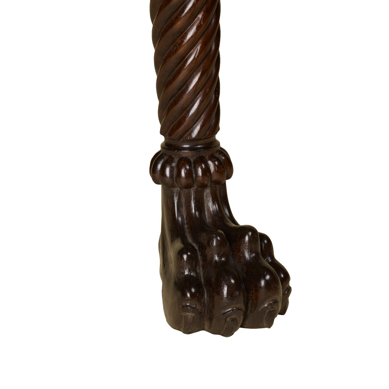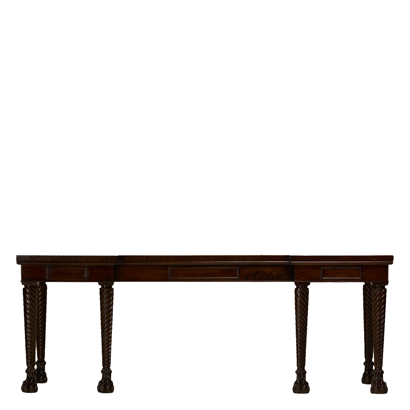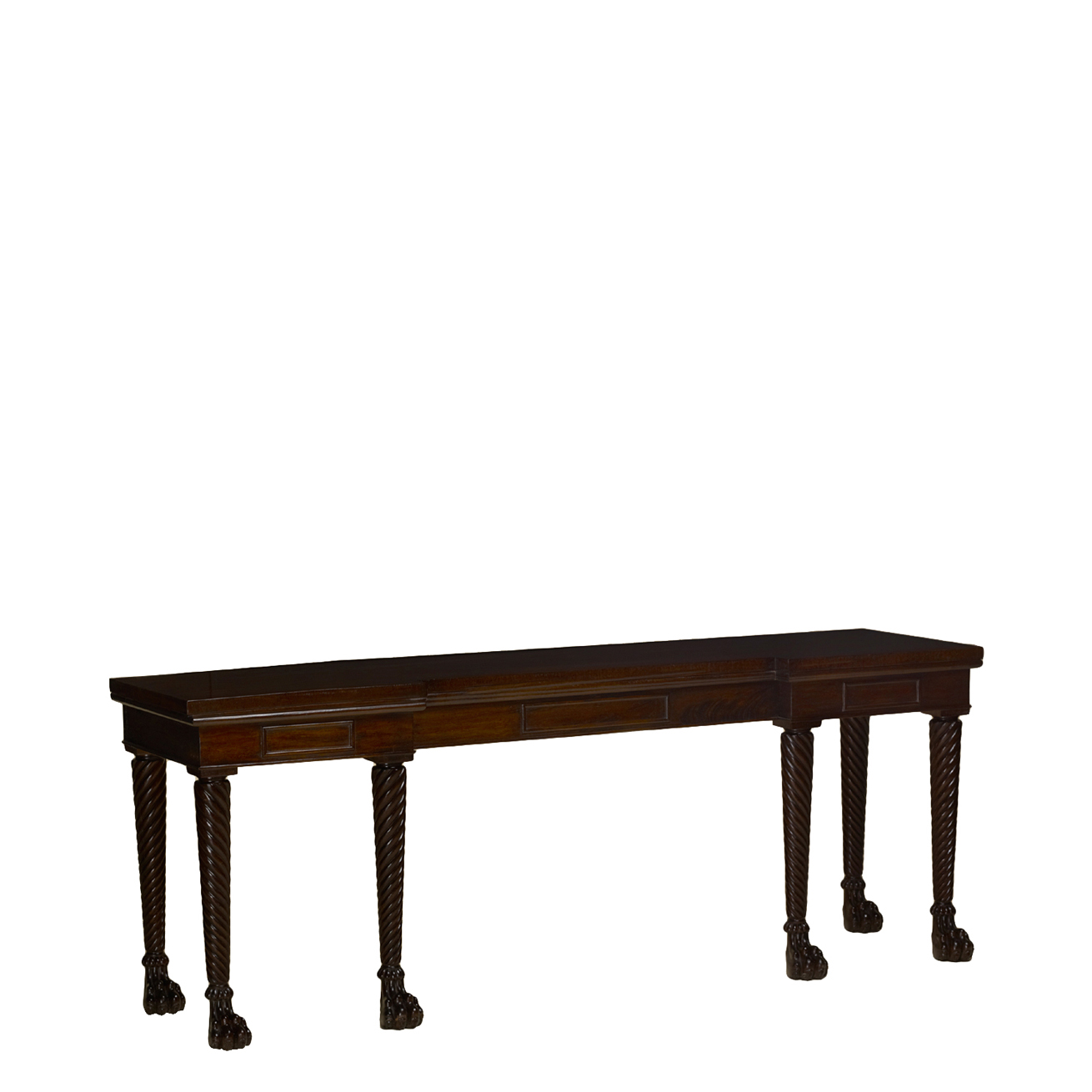 Console featuring one drawer, six carved twist legs on paw feet.