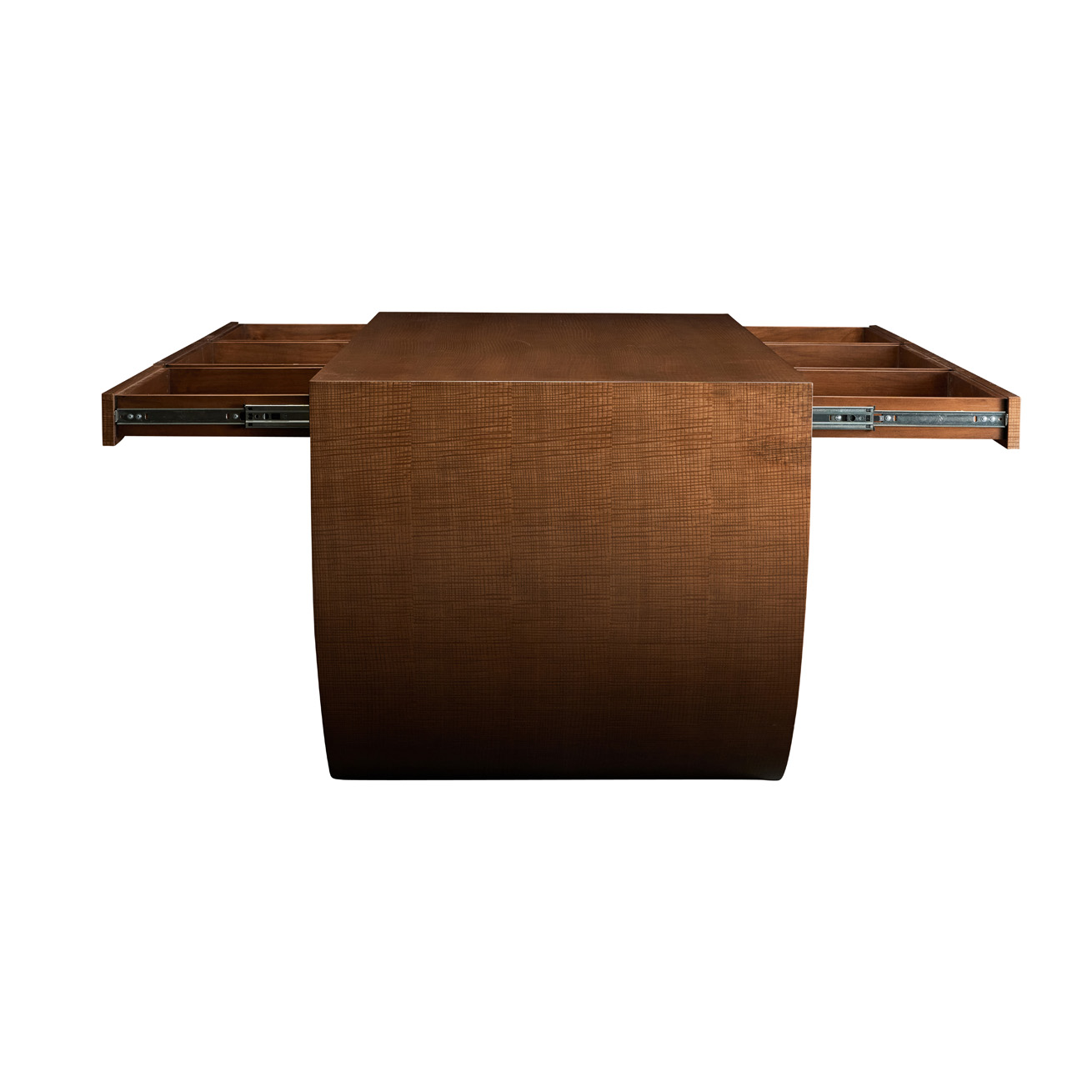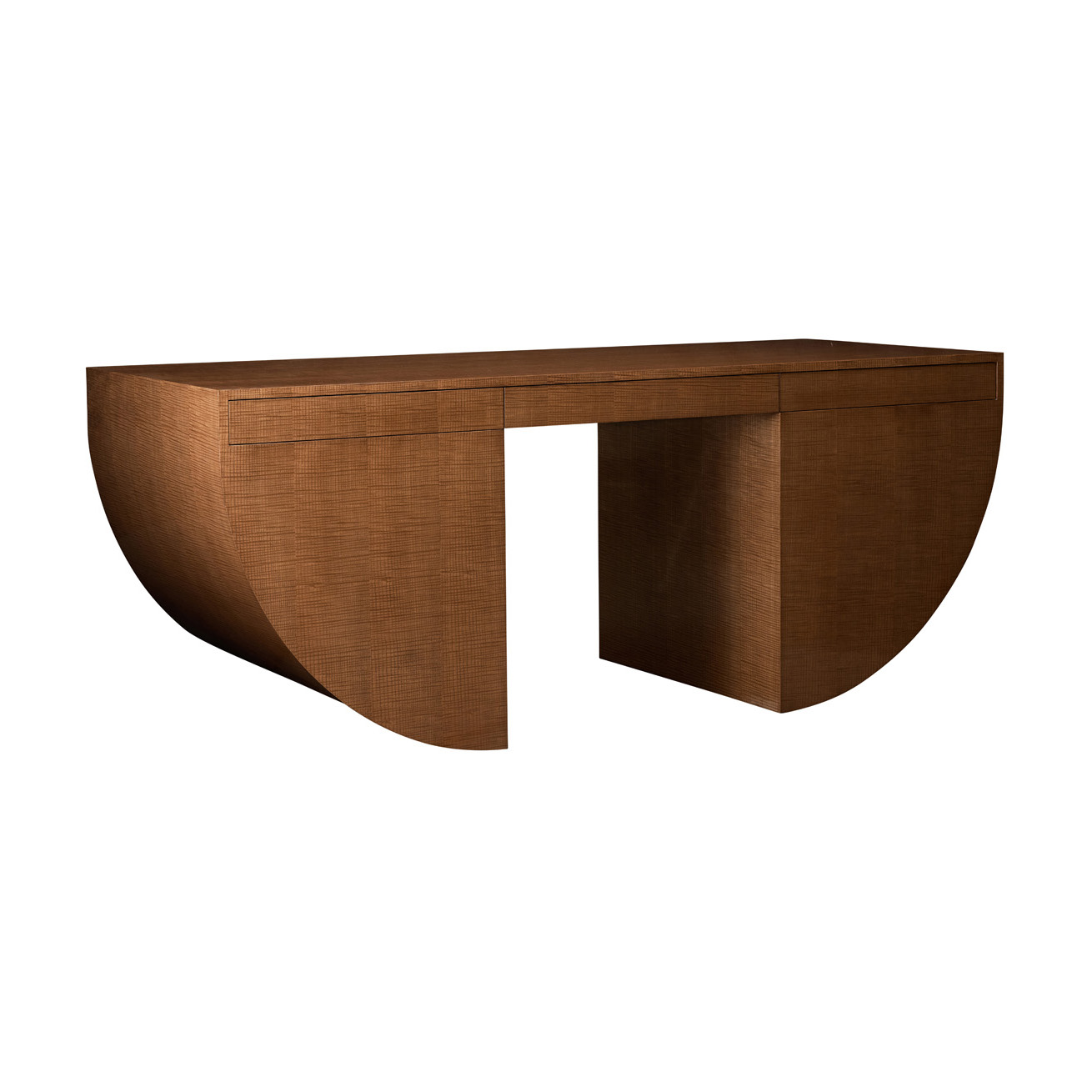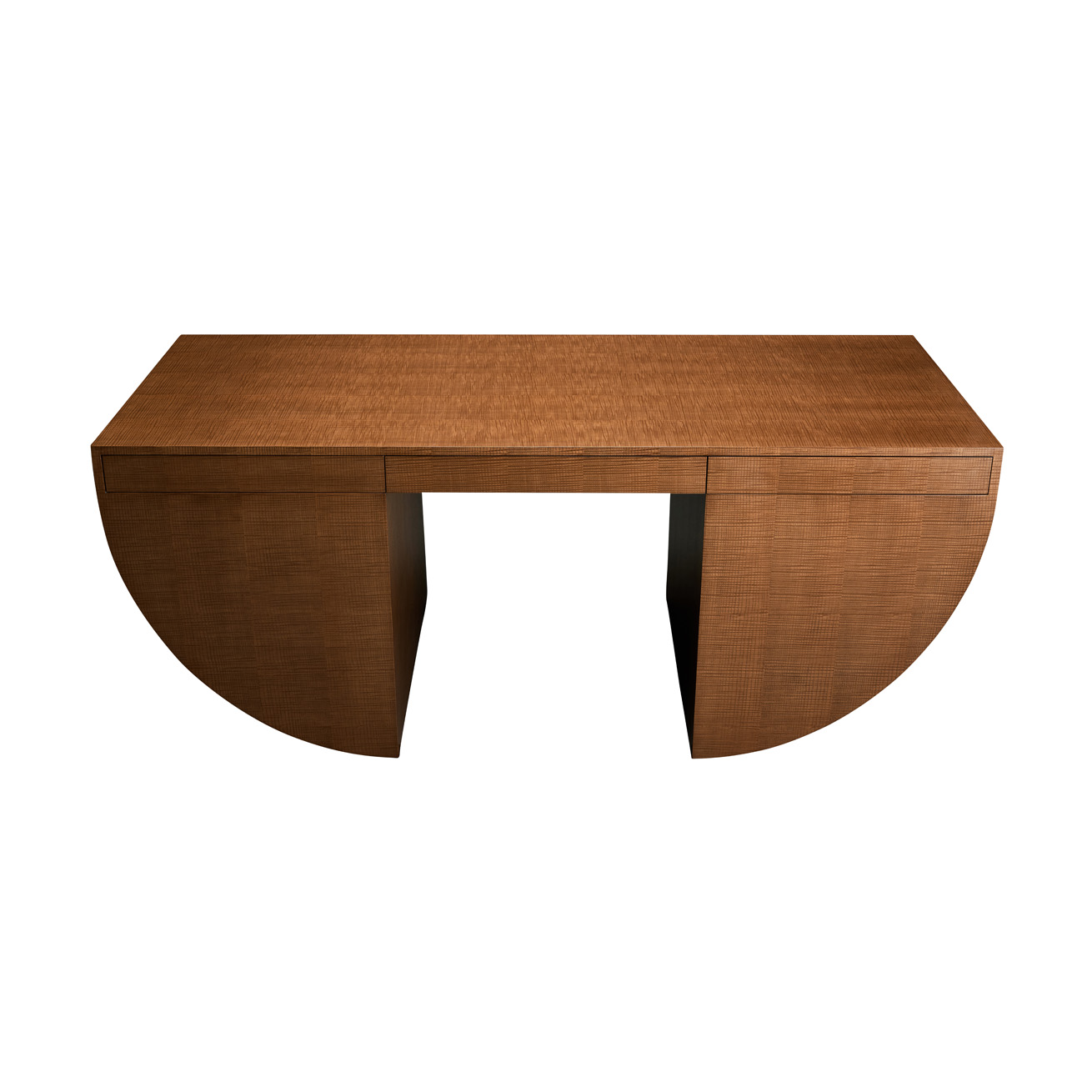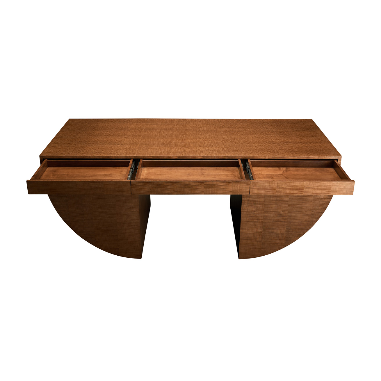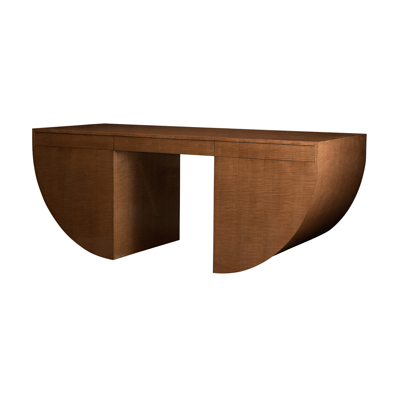 Desk featuring six flush drawers inset into two graphic pedestals.