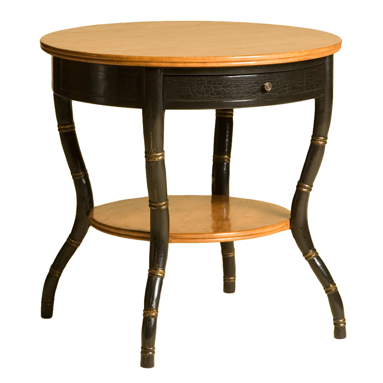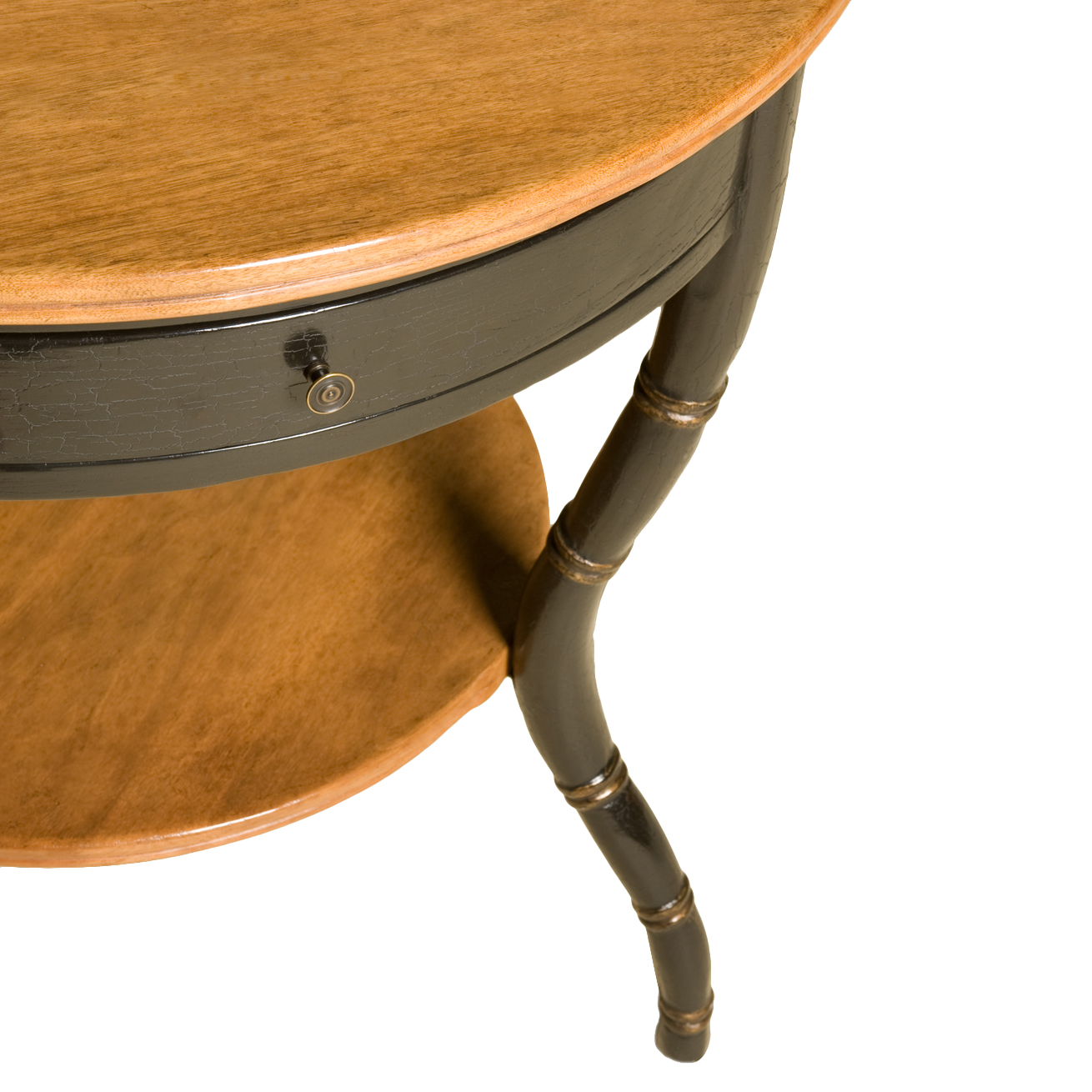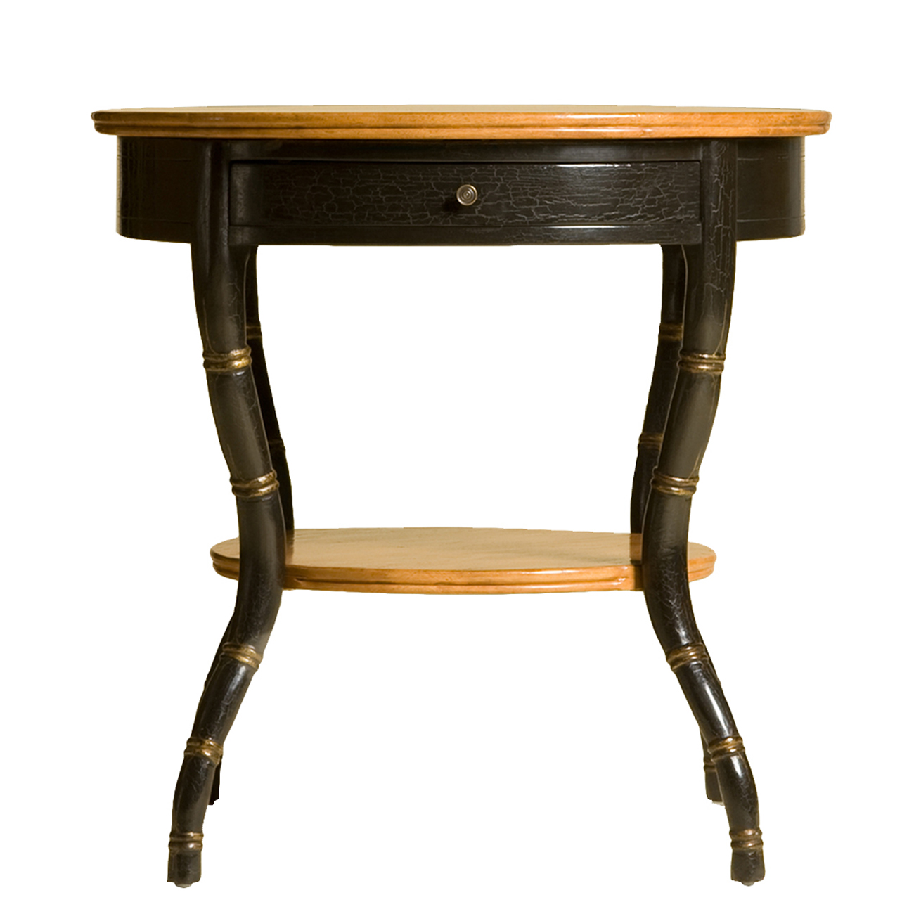 - Finish: Top and Shelf with Medium Walnut Stain | Apron and Legs with Tete de Negre Crackled Lacquer with Gilt Details
