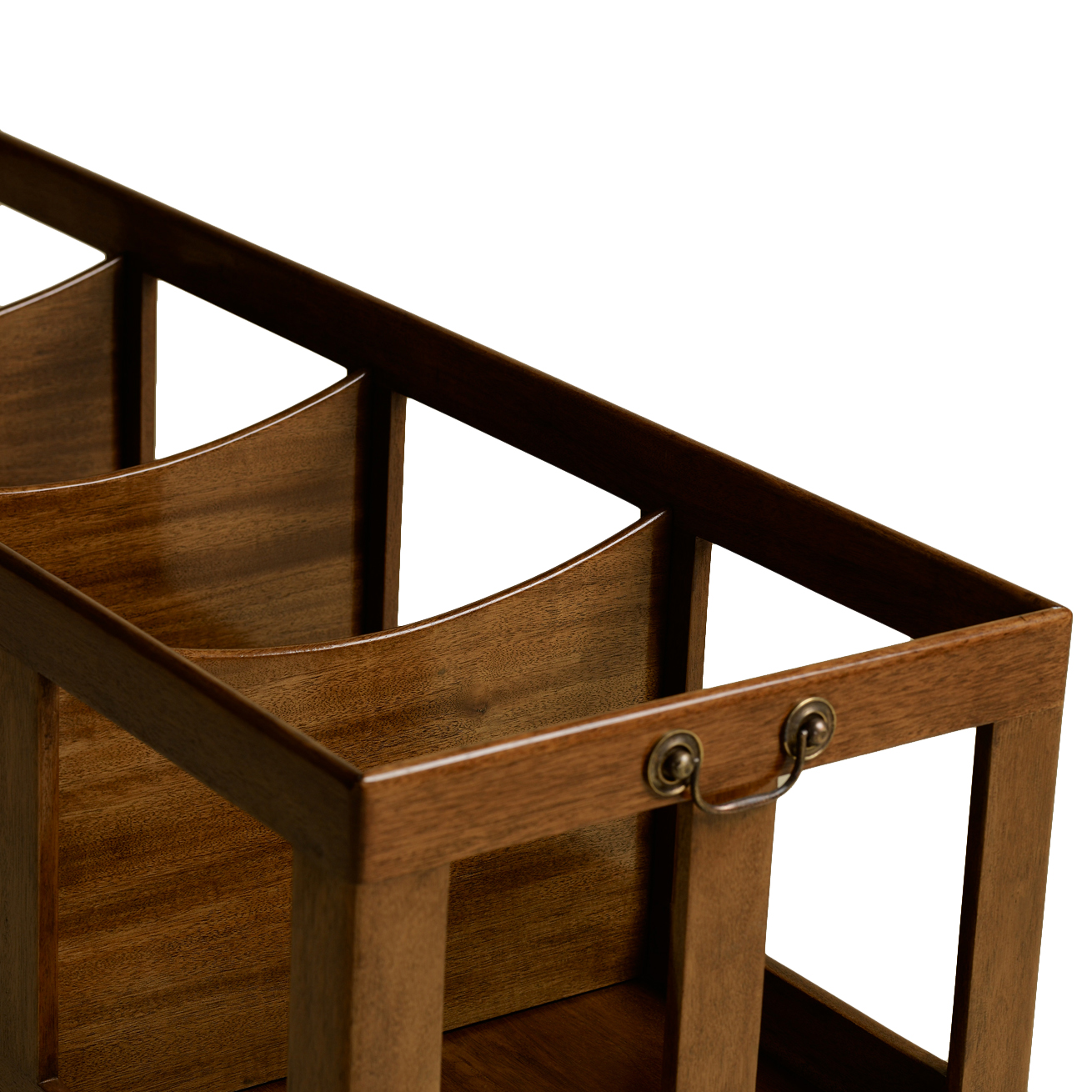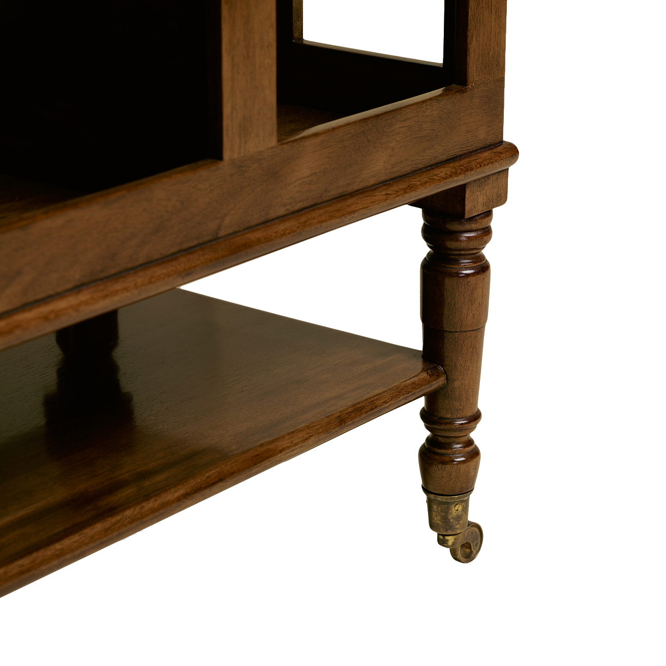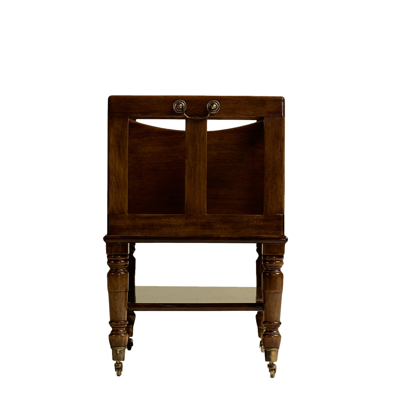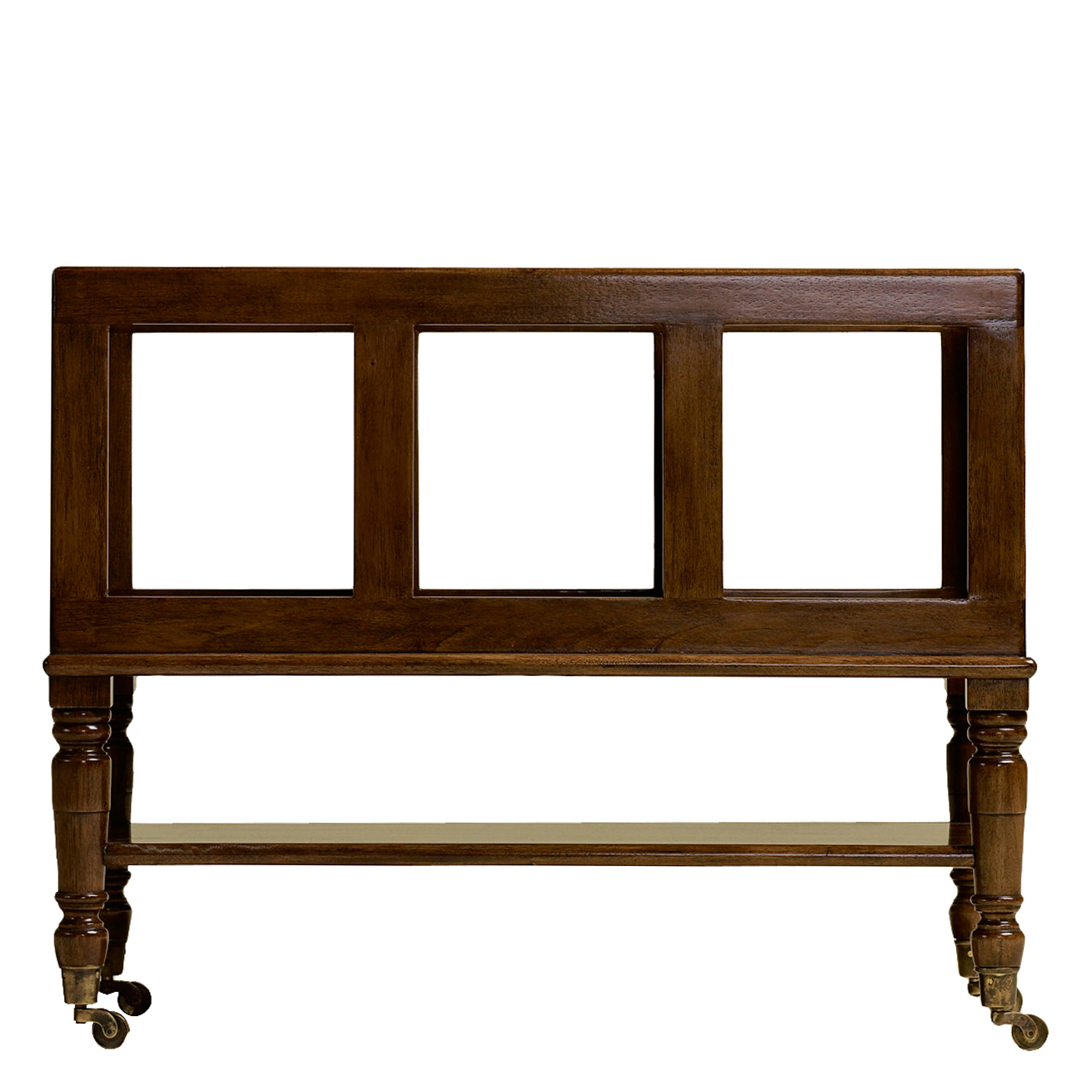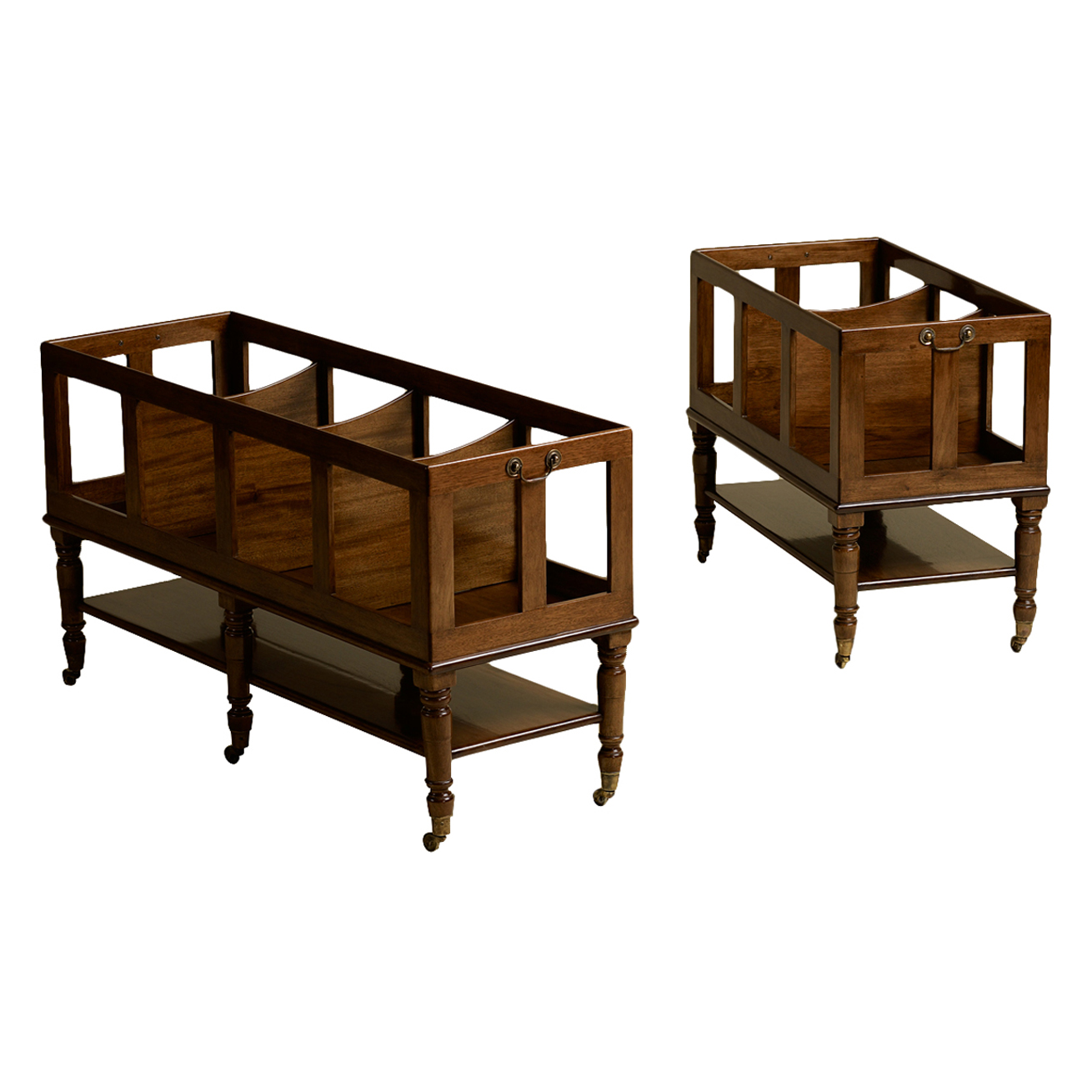 Large bookstand featuring four sections, a bottom shelf, and six legs with decorative casters. Small Bookstand featuring three sections, a bottom shelf, and four legs with decorative casters.