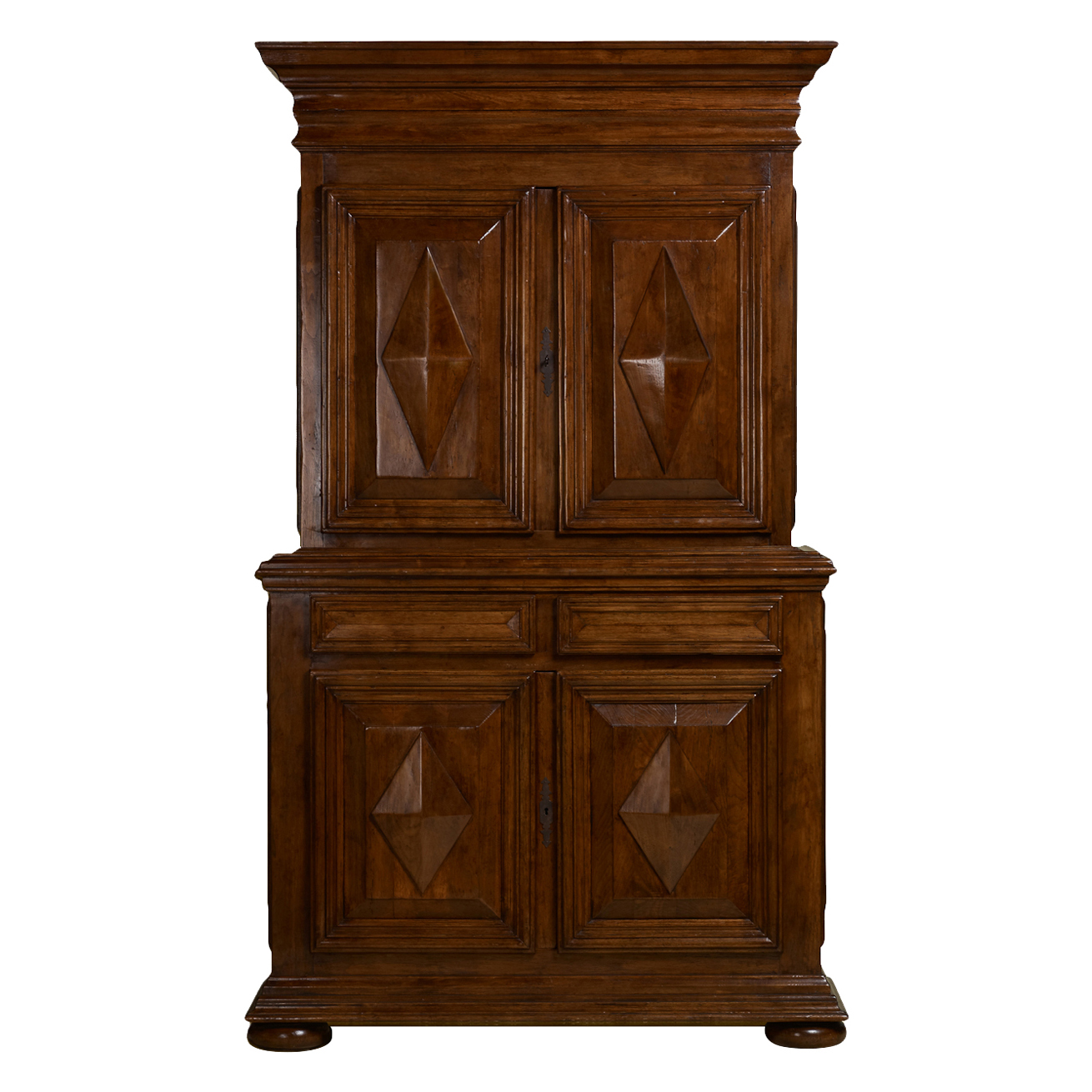 Cabinet featuring four doors, two drawers, and two adjustable interior shelves. Recommend attaching to wall at crown.