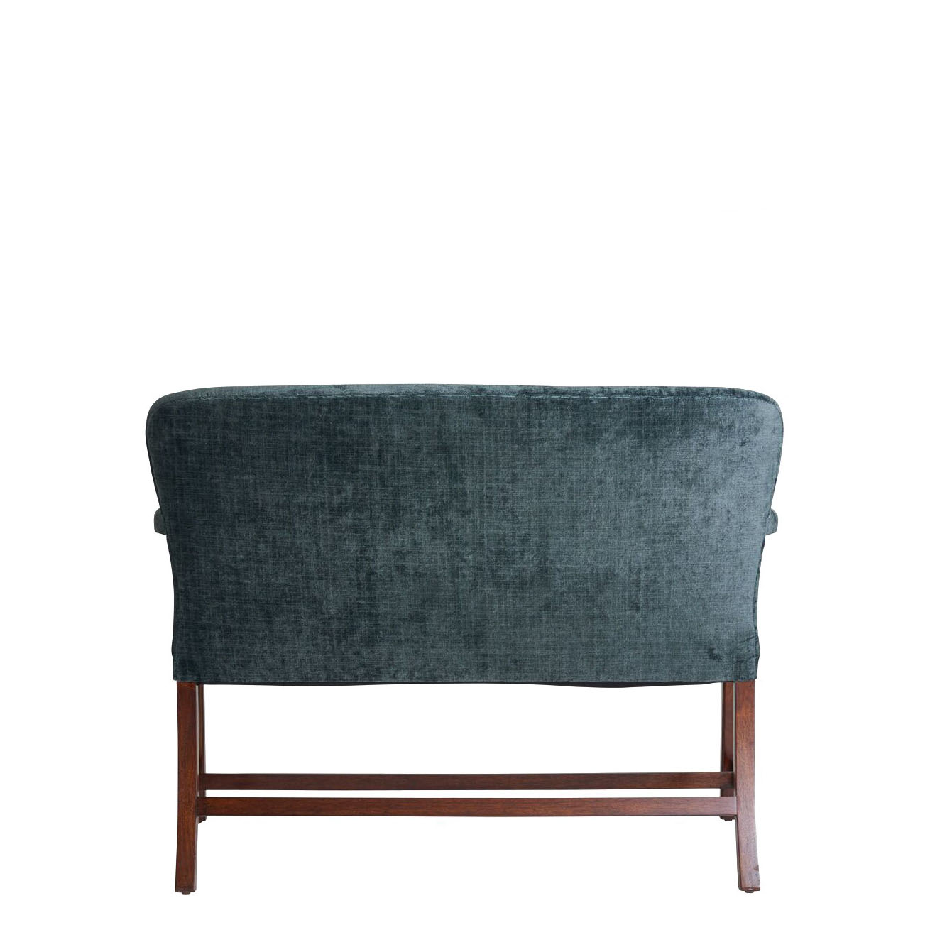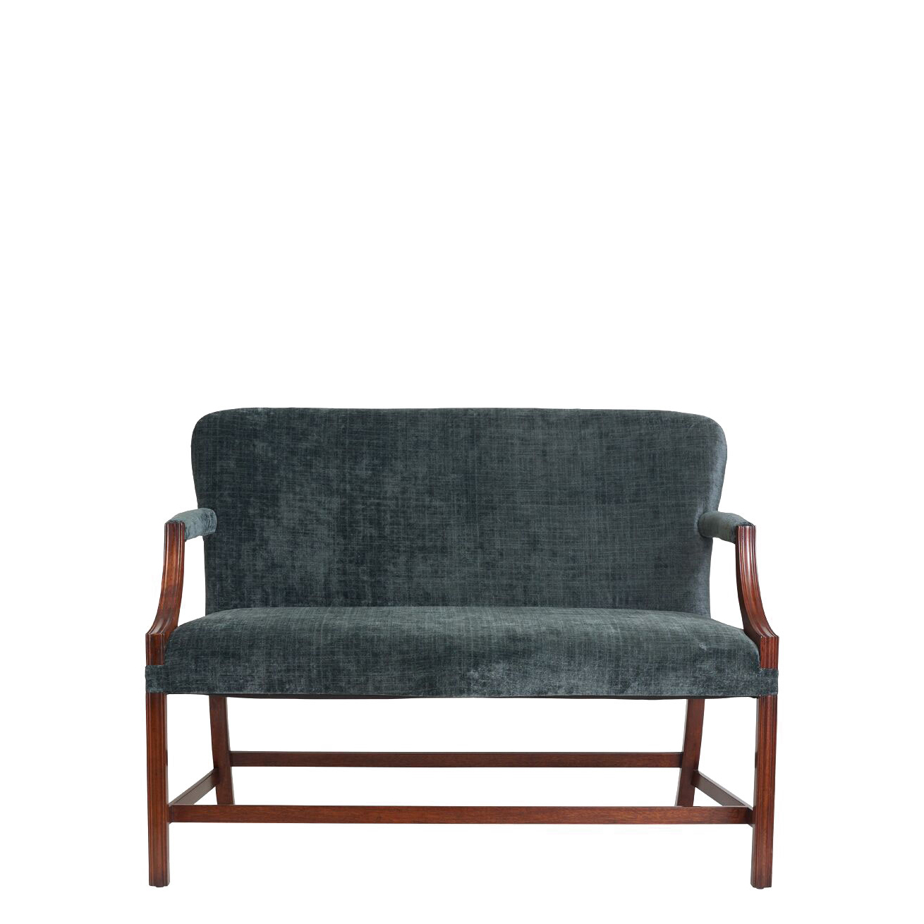 Settee with tight seat, tight back and upholstered arms, plain seams.