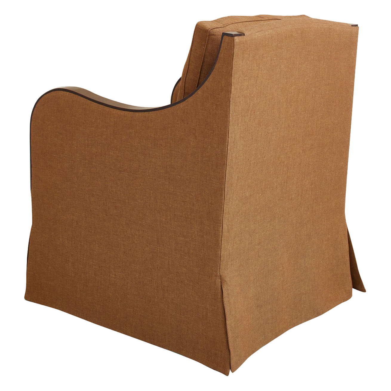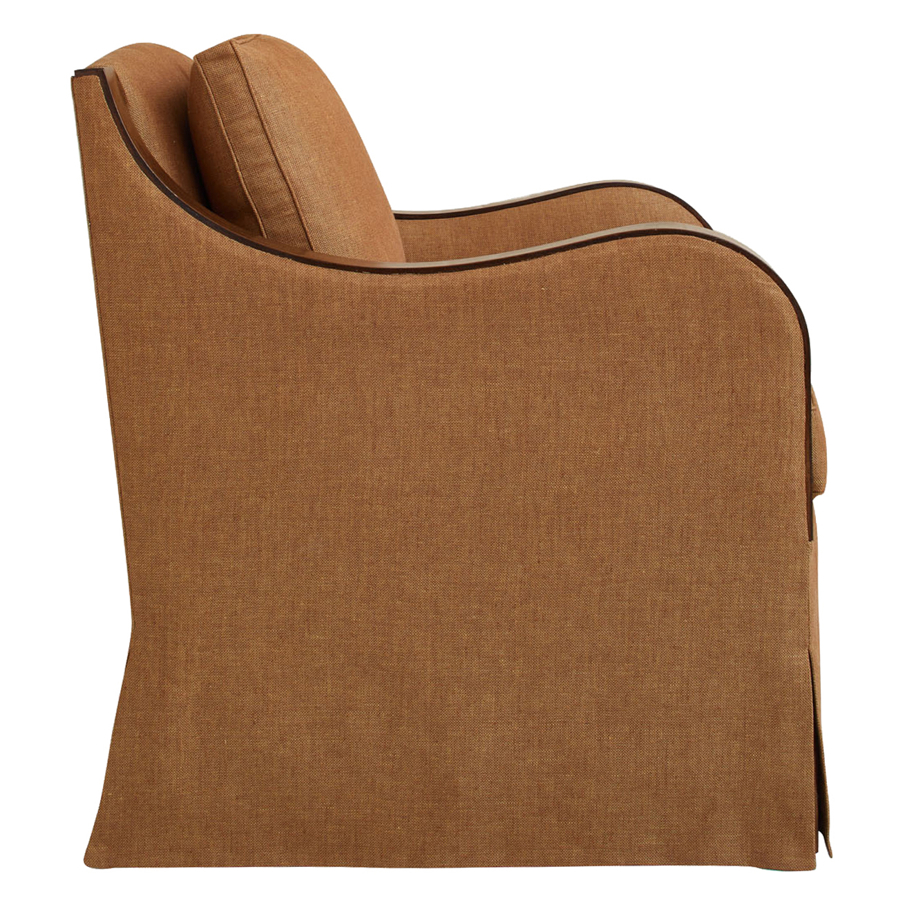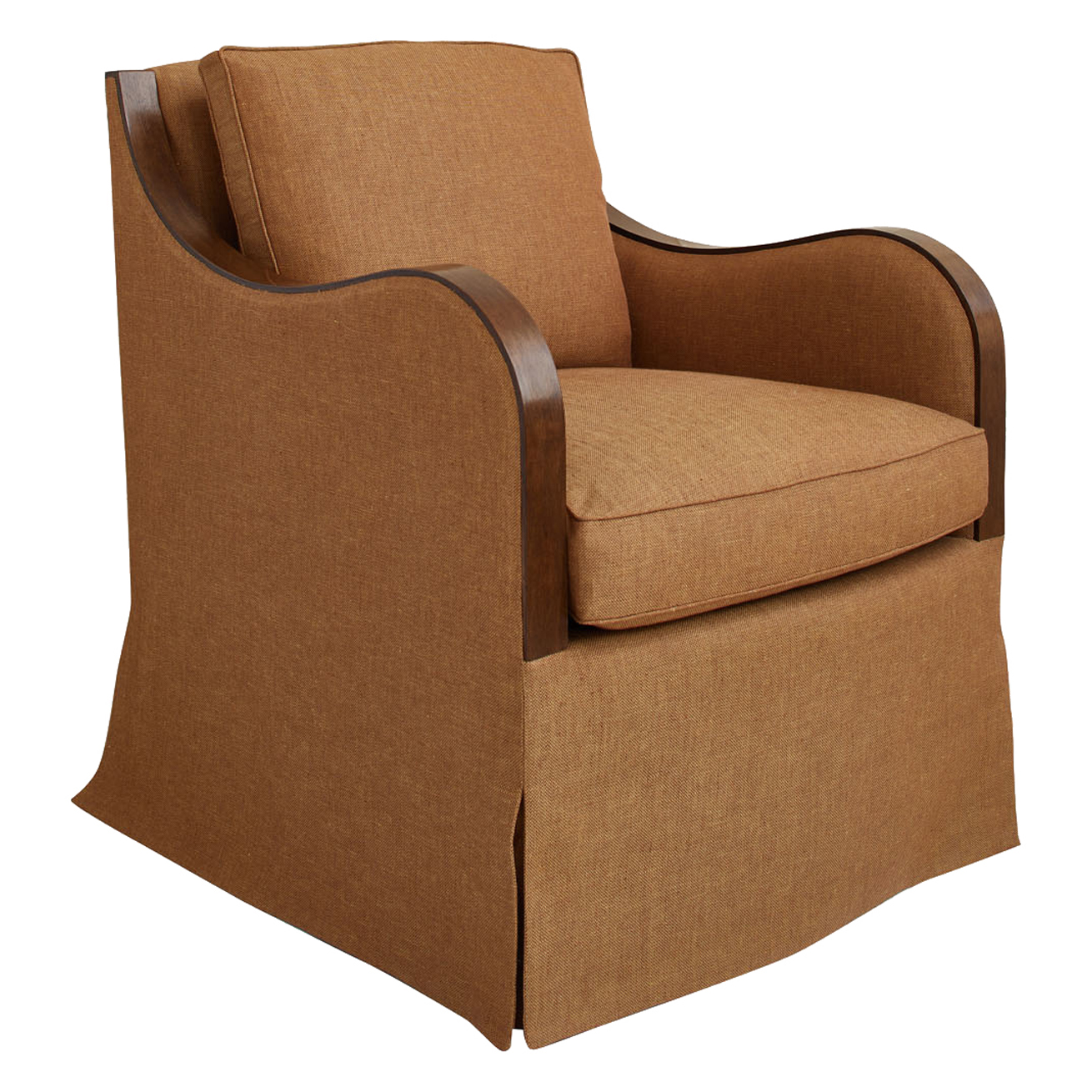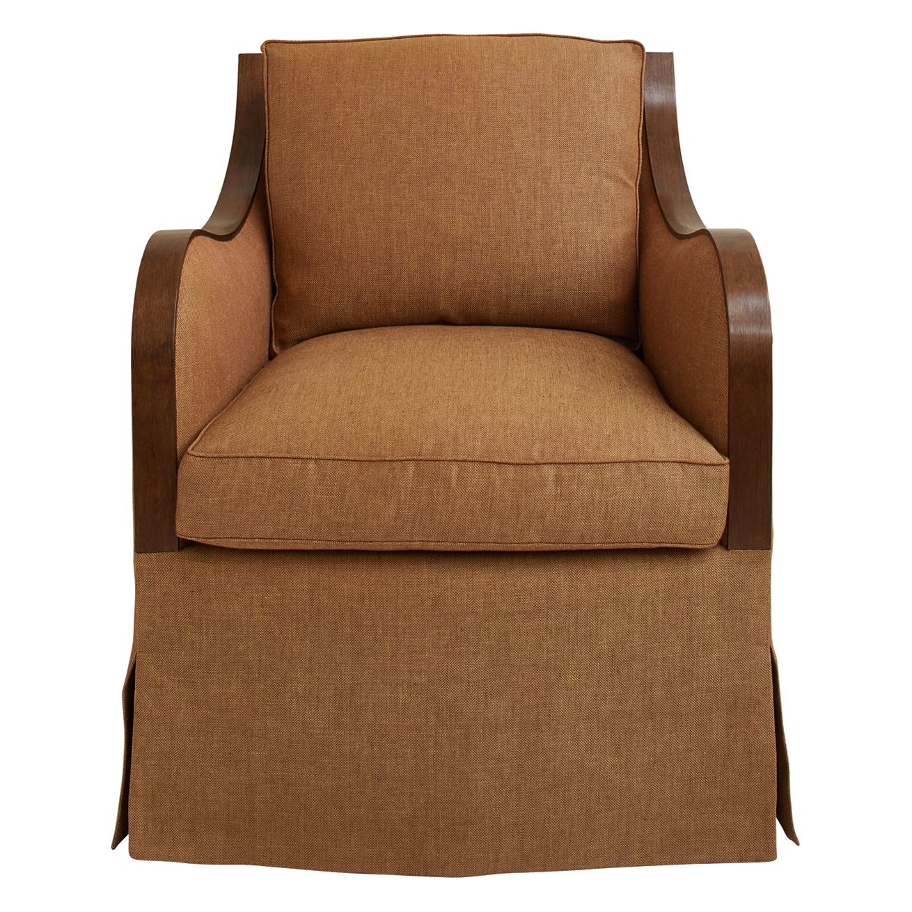 - Body upholstered with plain seams and loose seat and back cushions with self-cord welt. With wood arm caps. Skirted.