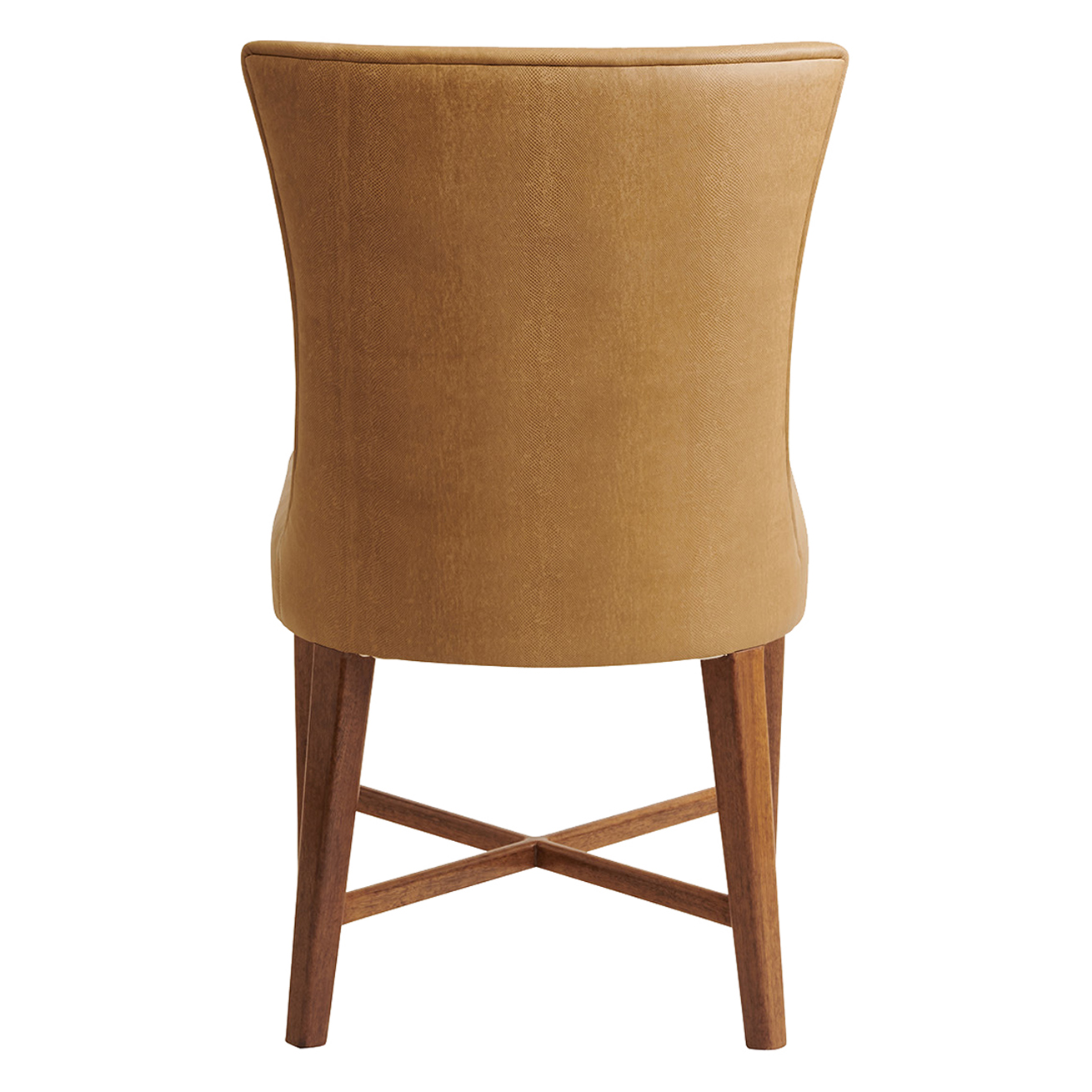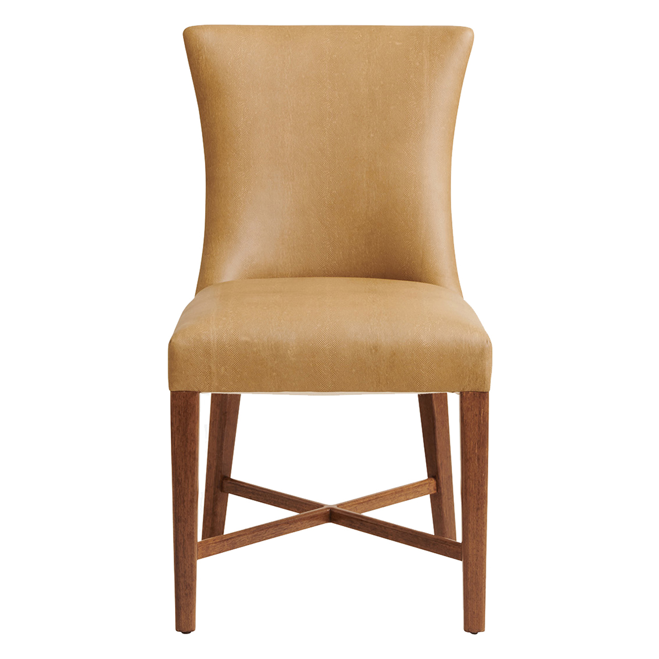 Upholstered barrel style chair with tight seat and back, features walnut legs and x-stretcher.