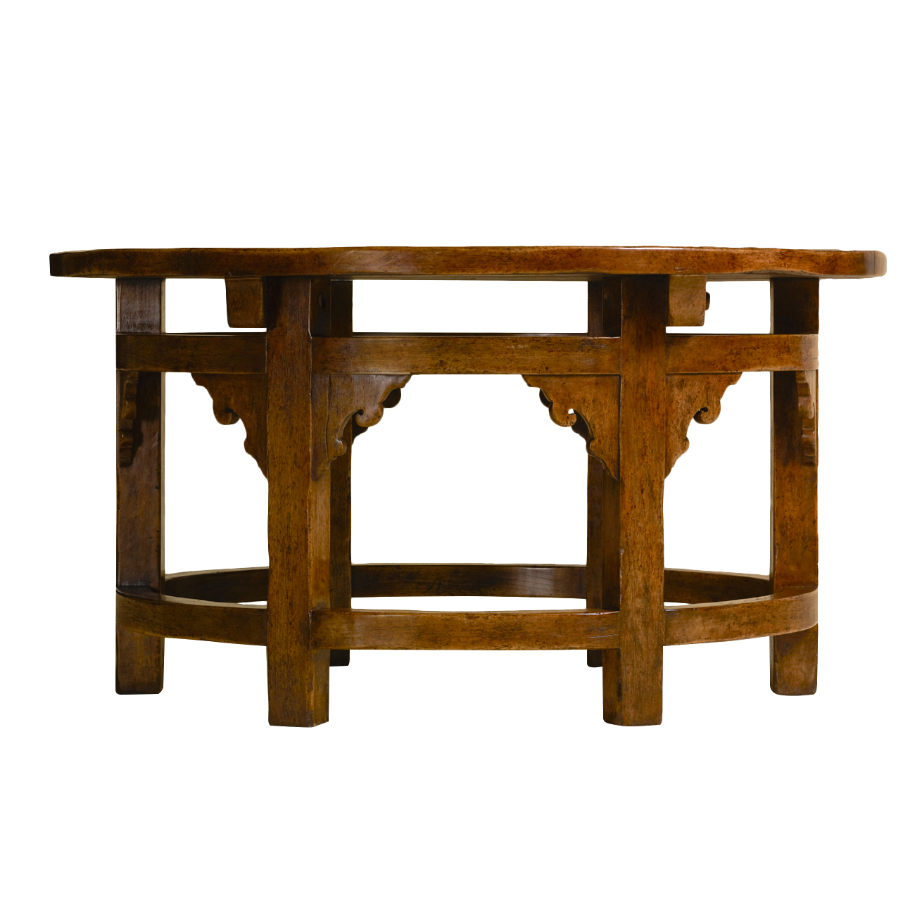 Center table featuring planked top, upper, and lower curved stretchers with corbels.