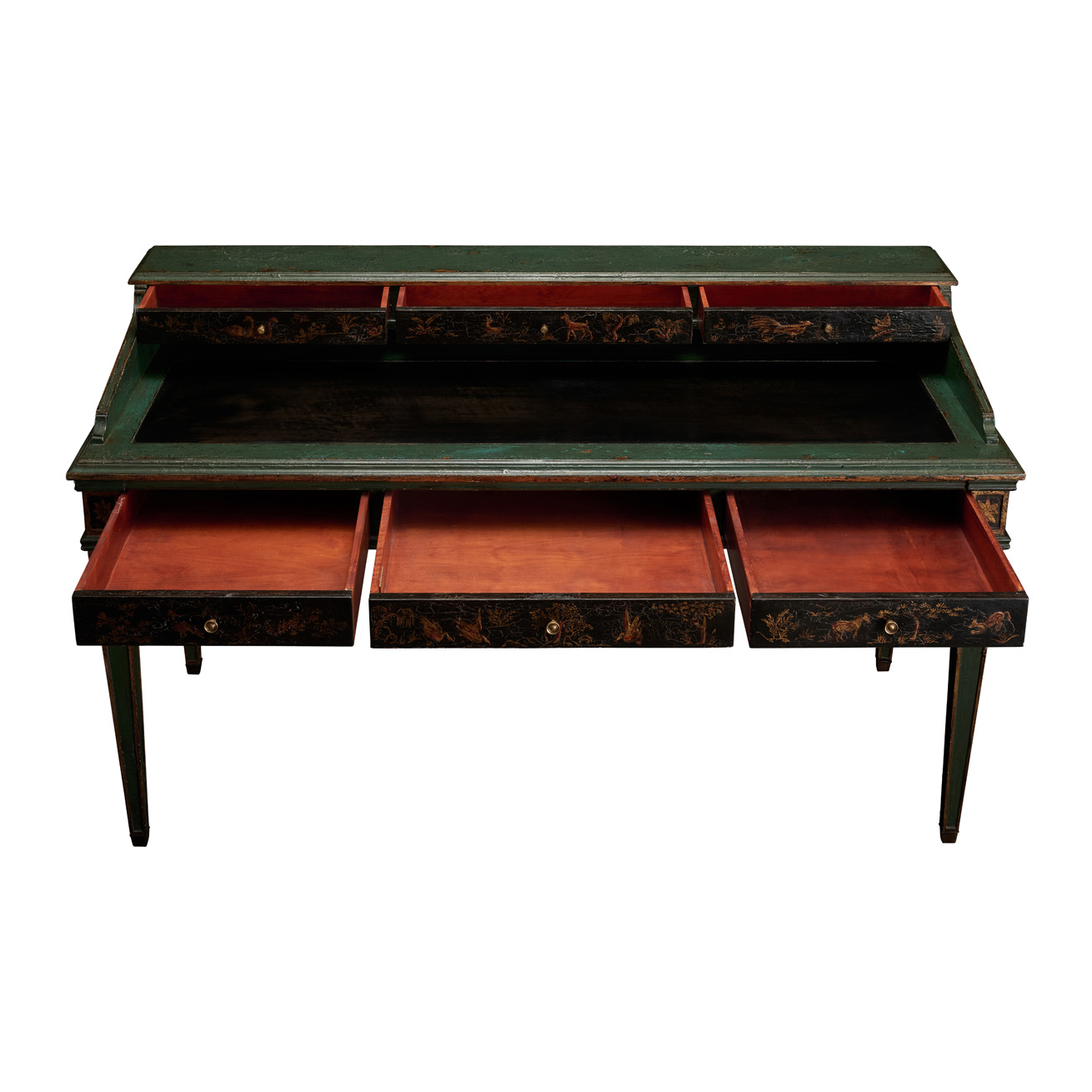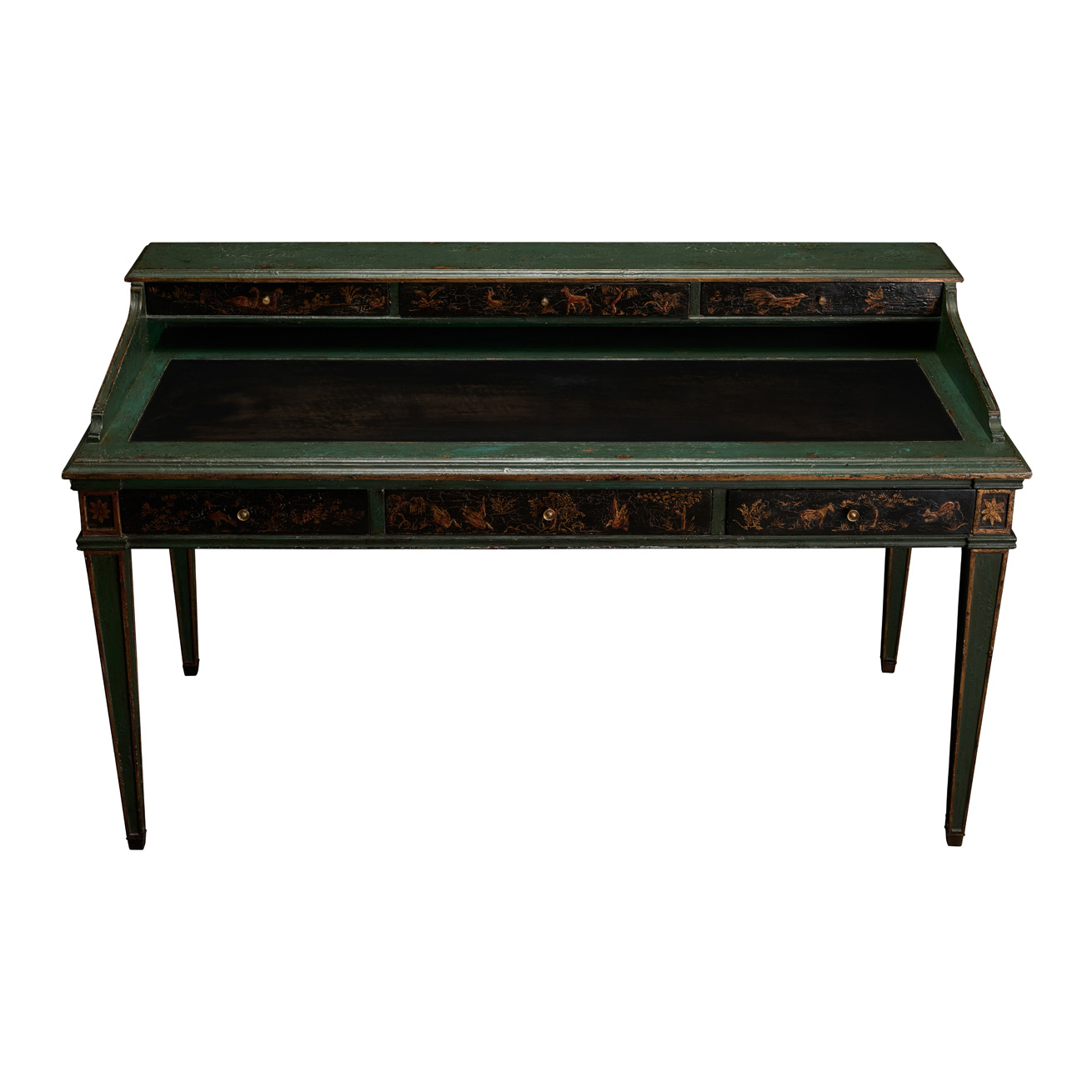 Desk featuring integral hutch with three drawers, three additional drawers in apron, inset leather top, atop tapering legs.