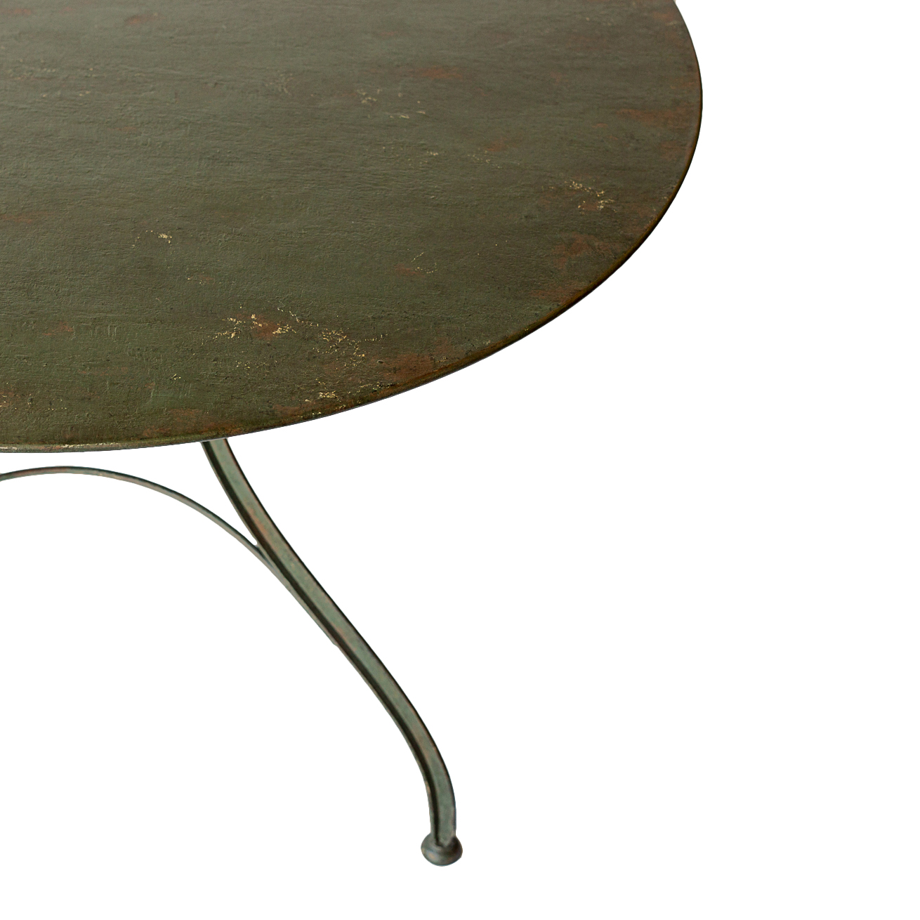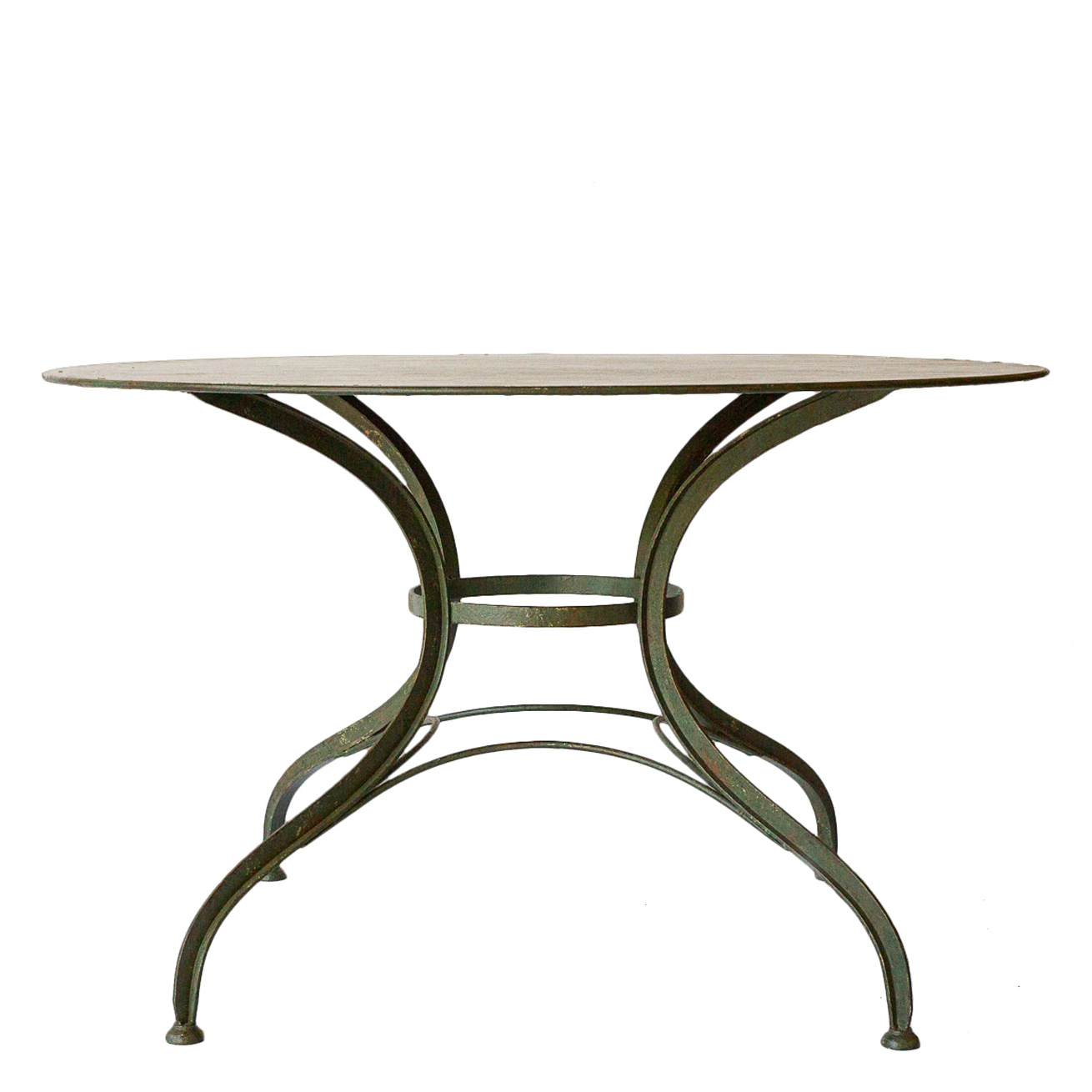 Dining table suitable for covered area outdoor use with four curved legs and round stretcher.